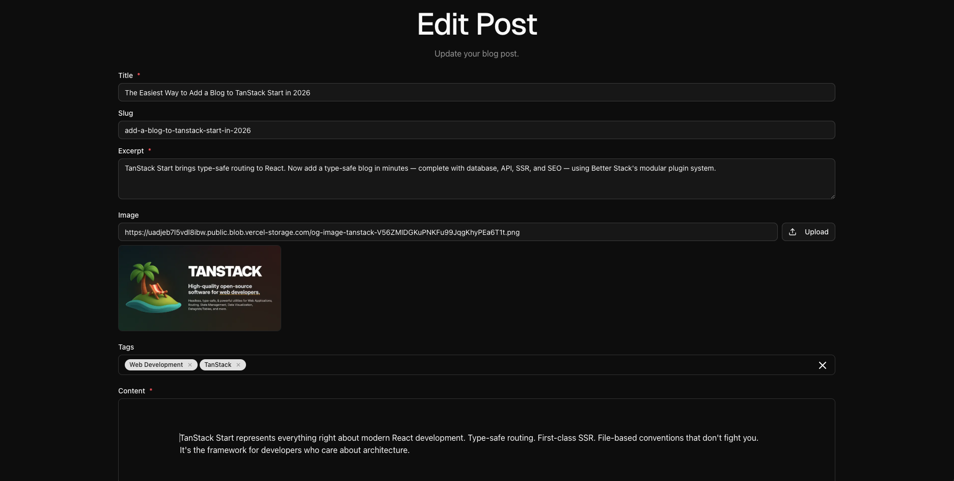 /blog- Blog homepage with published posts/blog/drafts- Draft posts page/blog/new- Create new post page/blog/:slug- Individual post page/blog/:slug/edit- Edit post page/blog/tag/:tagSlug- Posts filtered by tag