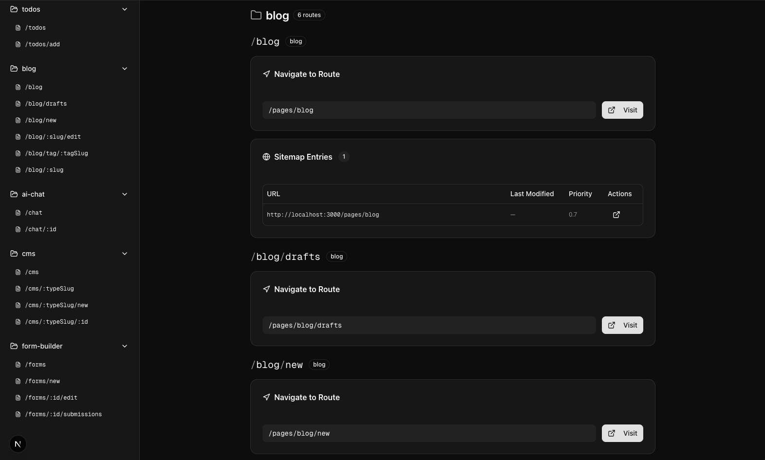 The Route Docs plugin automatically generates documentation for all your client-side routes. It provides an interactive reference page that displays route paths, parameters, sitemap entries, and navigation tools.